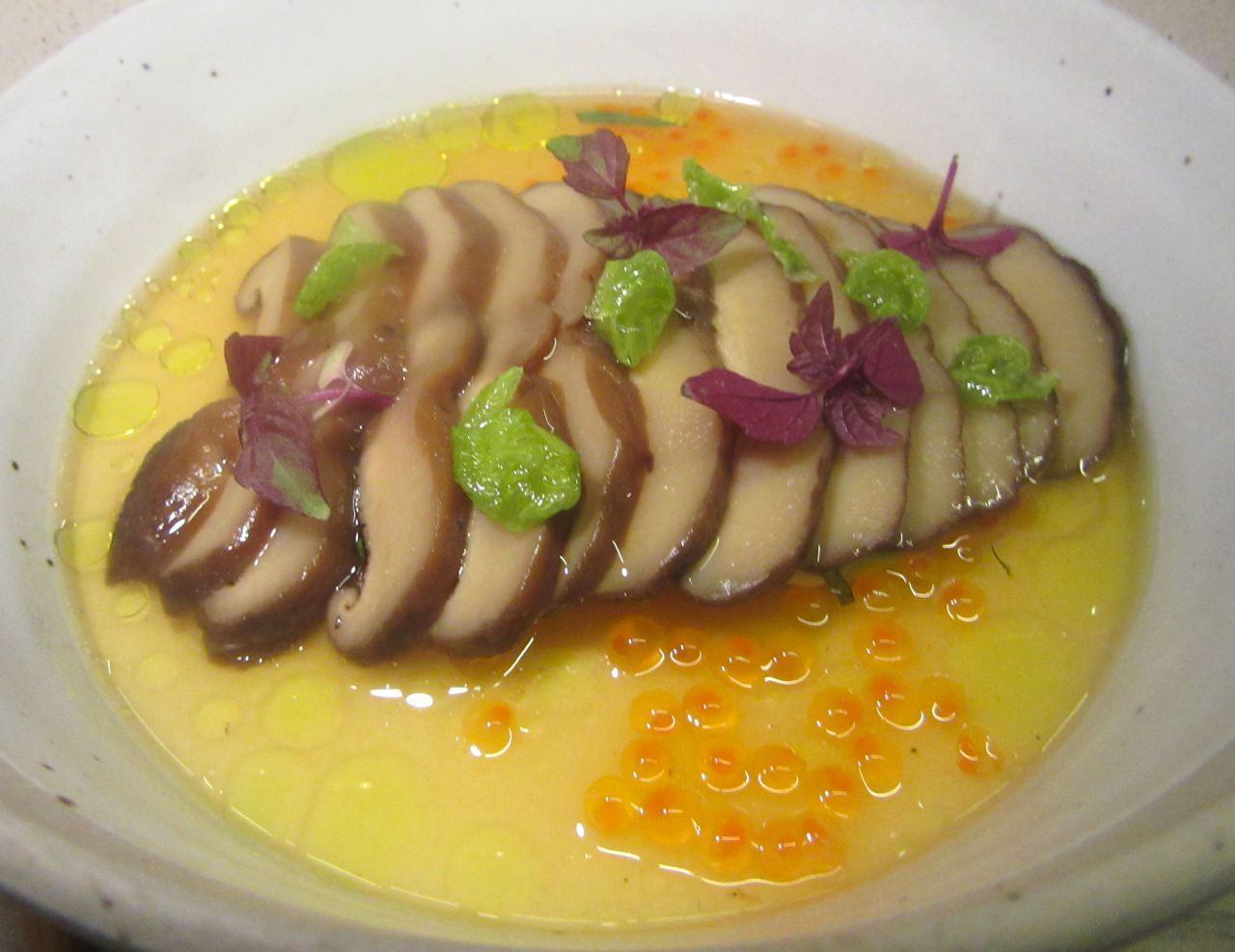 Since we were five that evening, we tasted at least a bite of most everything – the spicy beef tartare, lotus root sprinkled with black and ivory sesame seeds, and sparkling spring asparagus in a creamy dressing – one fat tip for each of us. A queue of mushroom slices lined up in a creamy yellow sauce with a flotilla of salmon roe.