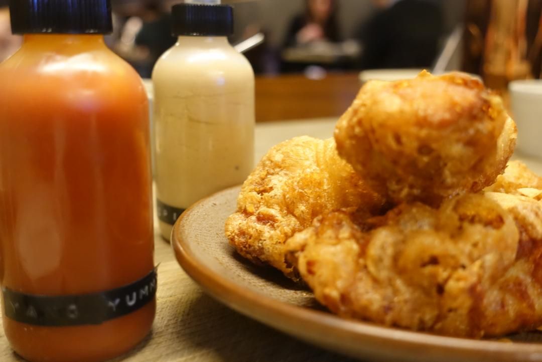 Fried chicken, a $23 extra, comes with squirt bottles of spicy peanut butter and the pungent gochujang.