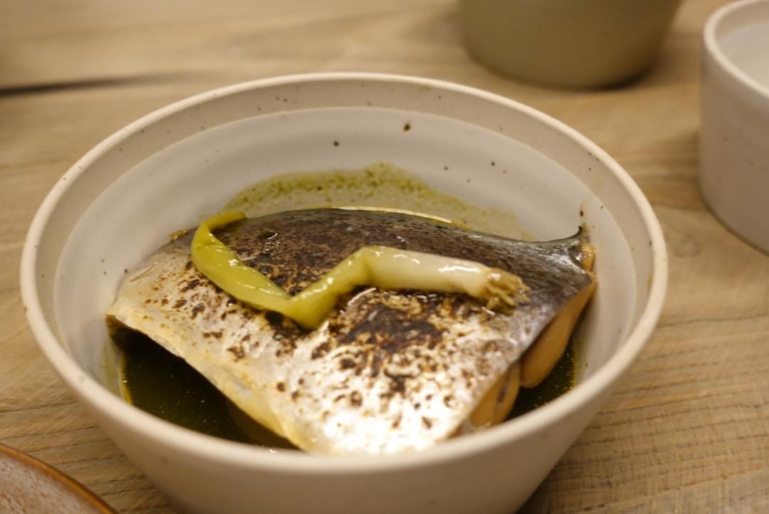 A thick chunk of tender mackerel comes in a deep bowl with green chili sauce and scallions.