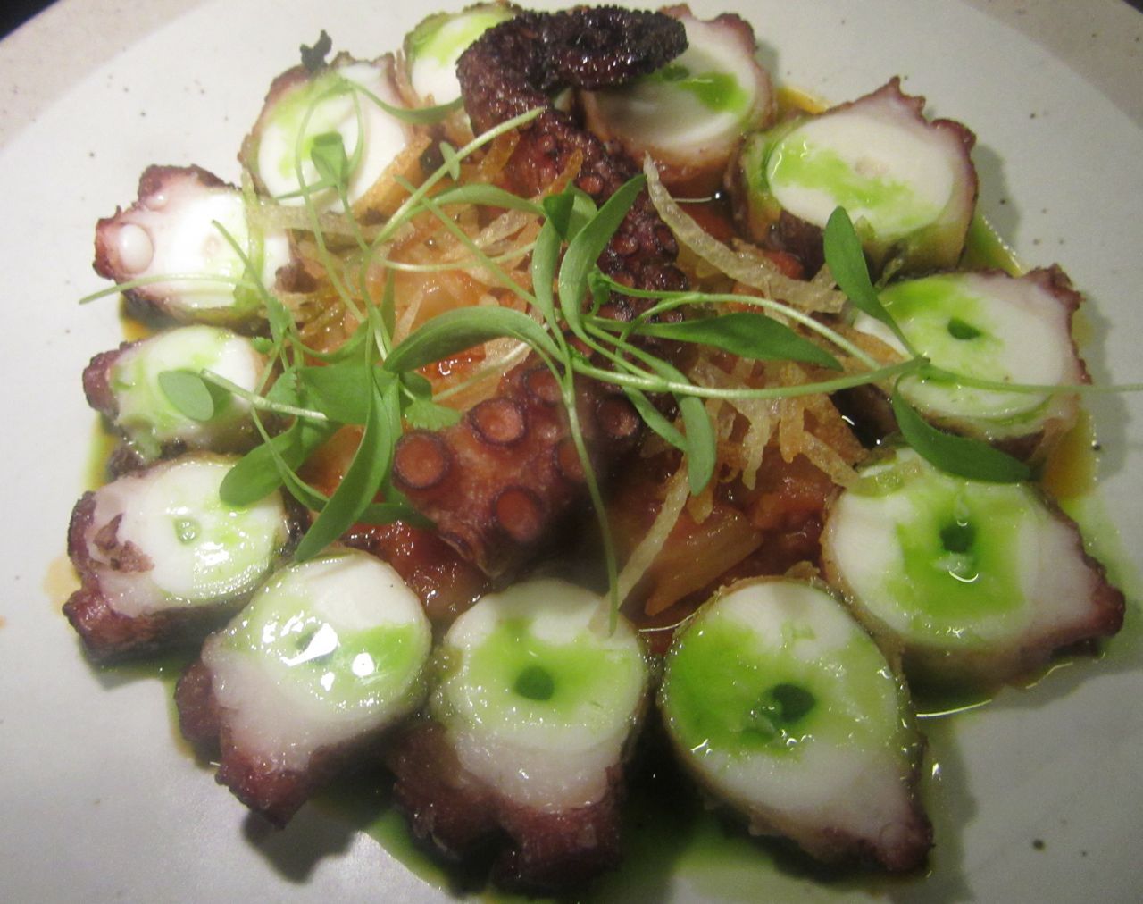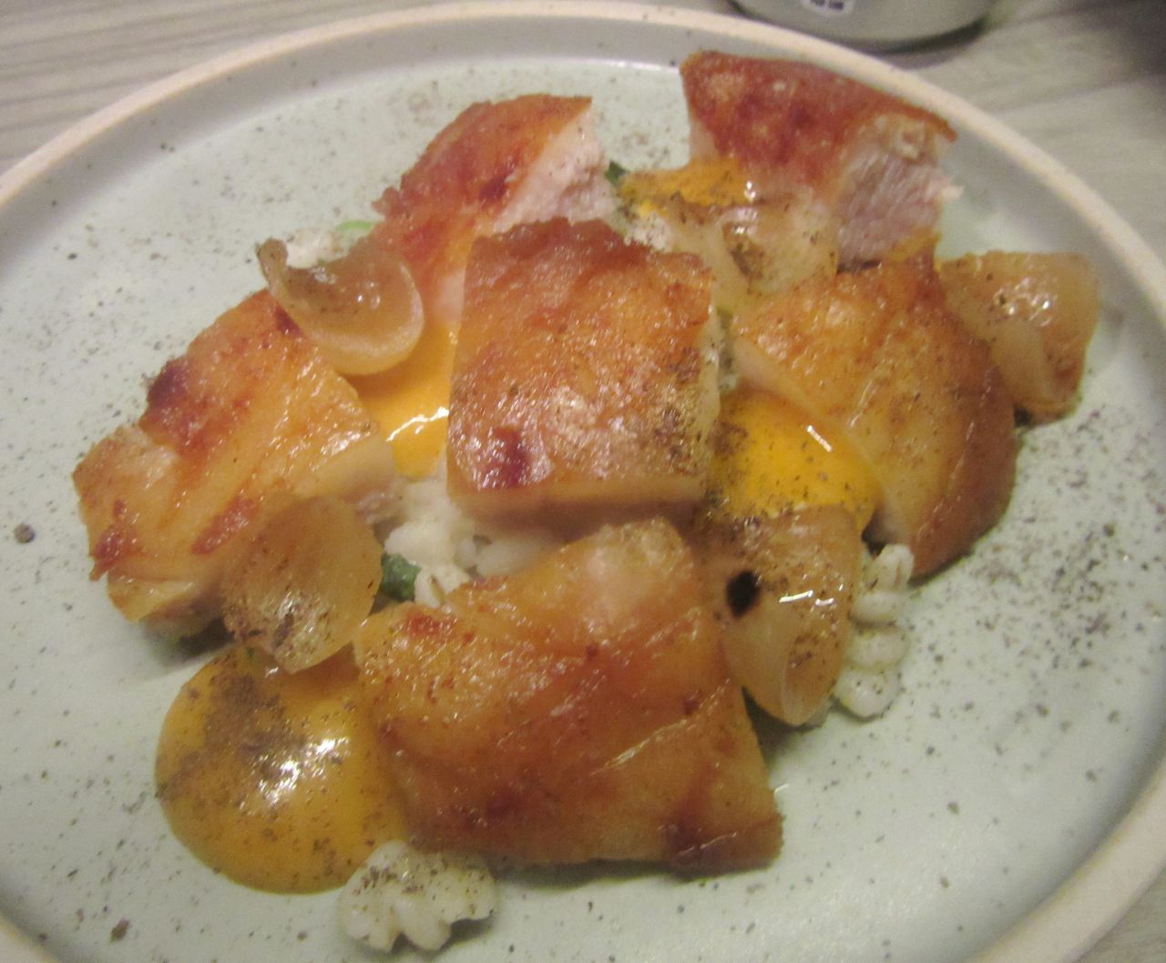 It was a season for corn and summer greens. The octopus was cut into chewy rings and dribbled with a citrus coulis. There were little saucers of classic Korean pickles. Potato chips fluttered on fat chunks of fried chicken anchored in spicy peanut butter. We ordered bowls of “seasonal” rice for $2 extra.