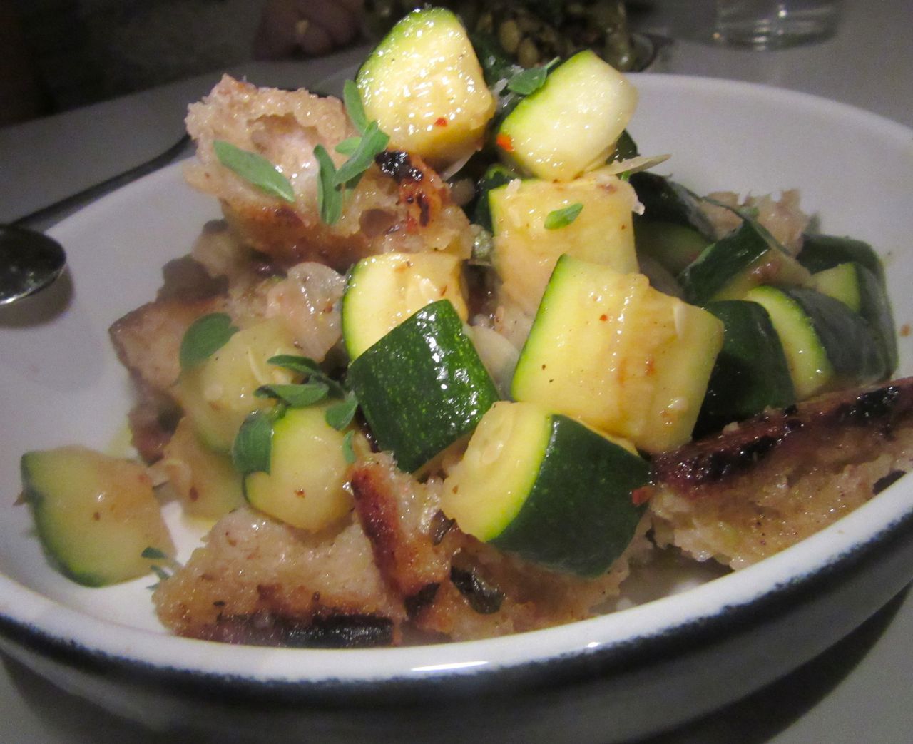 Oil-poached zucchini cubes are tossed capers, oregano and toasted bread chunks.