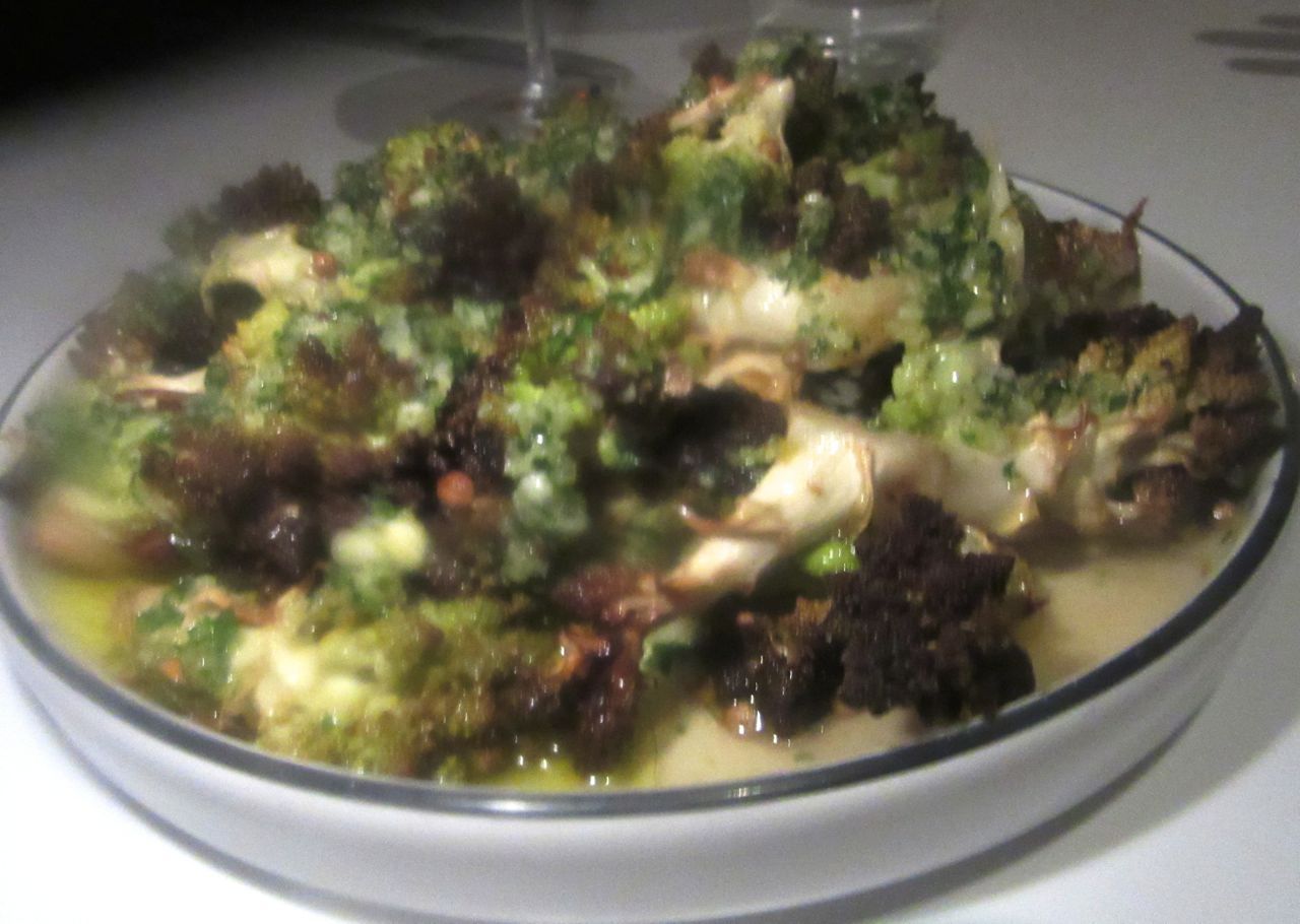 The green cauliflower called romanesco is roasted and dressed with a classic salmoriglio sauce.