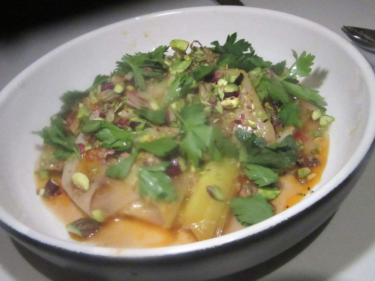On the seemingly endless drive, brutally misled by our Google map, I’m growing hungry. I remember the handmade mafaldini laced with pink peppercorns at Lilia. Now the five of us are pacing a bit in the crush around the entrance, not wanting to seem favored folk as we wait for our designated table to clear.