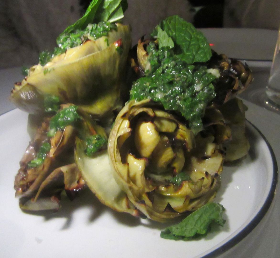 “We don’t need the raw fennel and celery,” I announce, but no one is listening. “I can live without the spaghetti with fennel pesto and Sicilian almonds.” Antipasti start to hit the table. One or two at a time. Grilled baby artichokes with mint salsa verde, savory and full of flavors, a small bulb for each of us. We have to remind our waitress to bring serving spoons and forks. Sometimes she remembers. Sometimes she forgets.