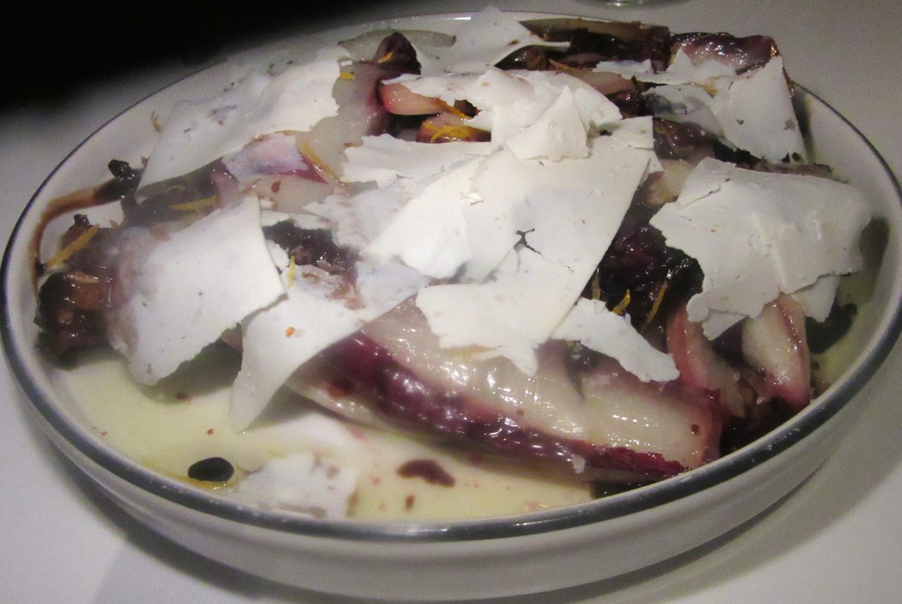 Radicchio and cipollini onions are tossed with melted bone marrow, balsamic and ricotta salata.