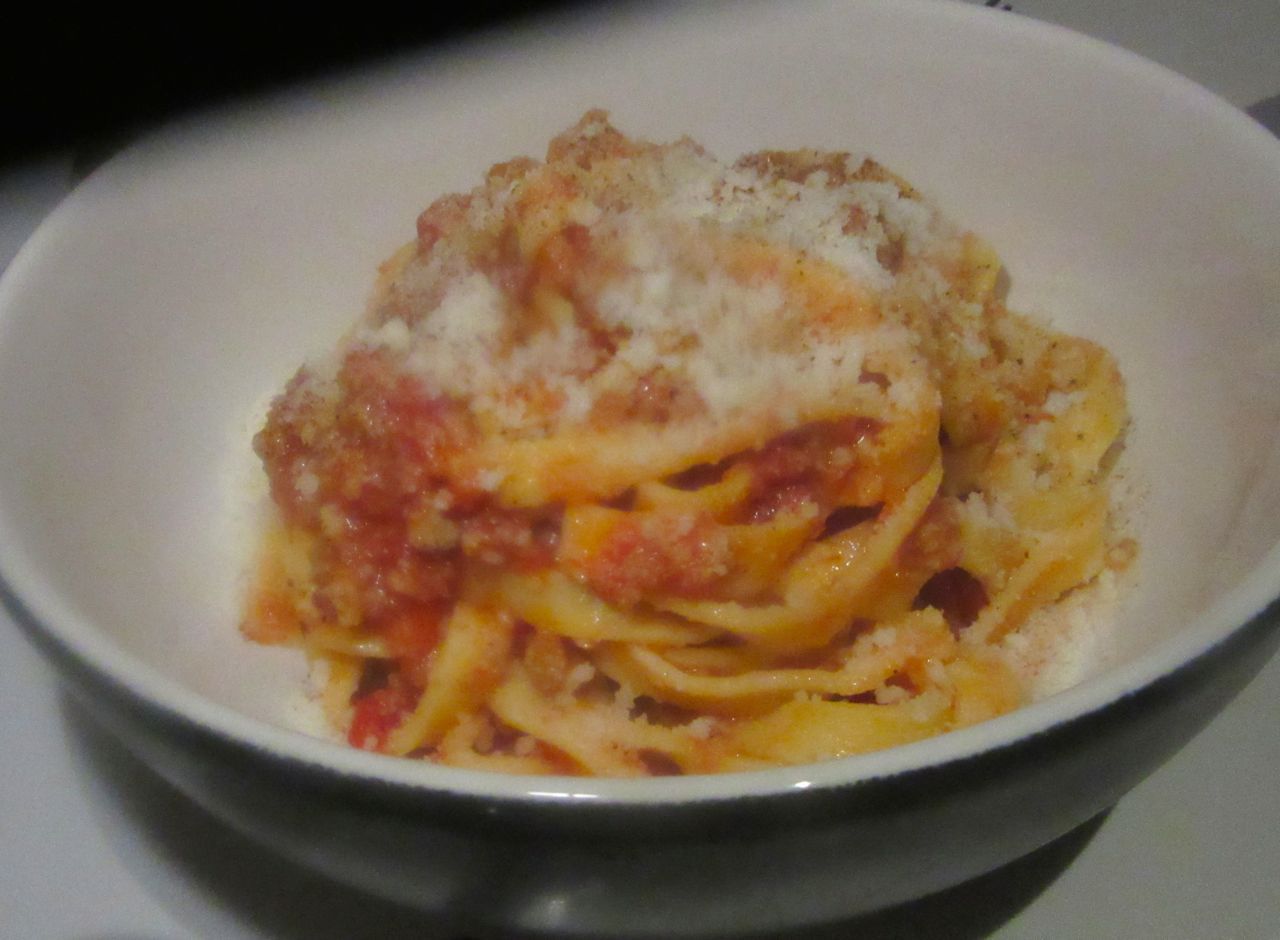 My pals are chatting, studying the menu, deciding on drinks. An olive oil martini sounds gruesome to me. But I’m not the martini type anyway. The server comes and goes, then comes again, and goes, and then we wait. It’s a wonderfully eccentric menu, just antipasti and pasta. I can live with that. My two favorite courses after all. Ryan orders a $65 bottle of wine none of us have ever heard of. Koppitsch unfiltered.